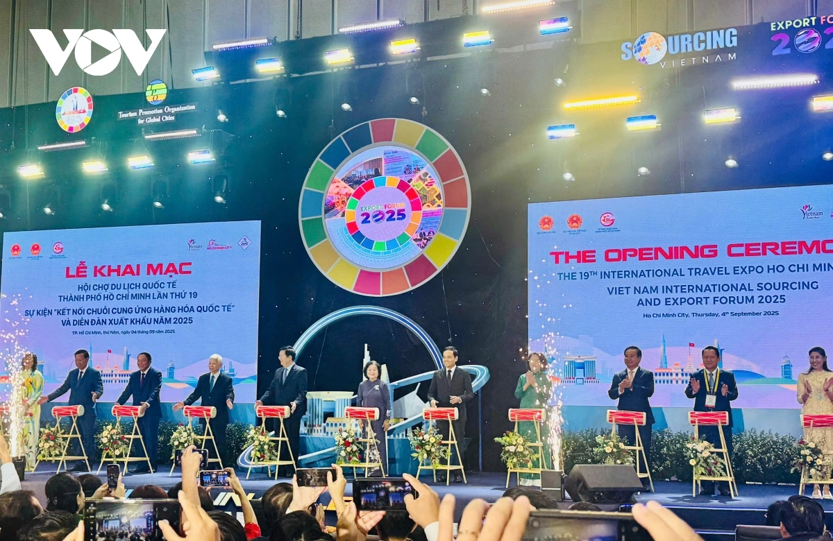 VOV.VN - Chuỗi sự kiện Hội chợ Du lịch Quốc tế Thành phố Hồ Chí Minh (TP.HCM) lần thứ 19 năm 2025; Diễn đàn xuất khẩu năm 2025 và chương trình “Kết nối chuỗi cung ứng hàng hóa quốc tế” chính thức khai mạc vào sáng ngày 4/9/2025, tại Trung tâm Hội chợ và Triển lãm Sài Gòn (SECC), TP.HCM.