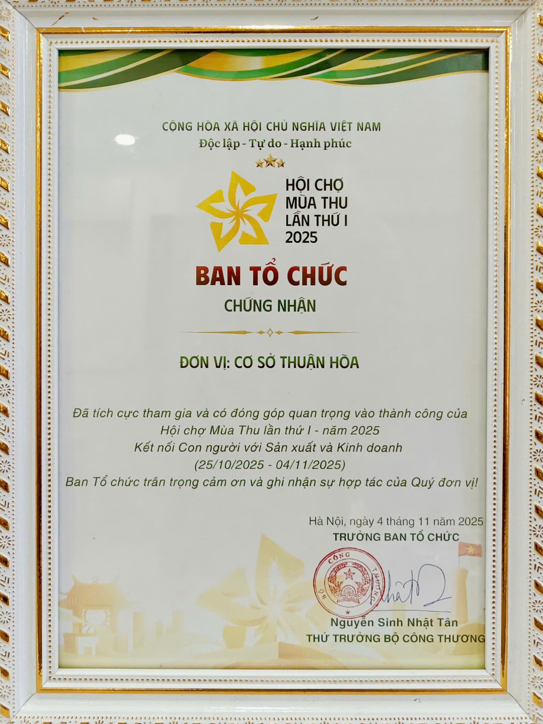 Cơ Sở Thuận Hòa vinh hạnh nhận Giấy Chứng Nhận từ Ban Tổ Chức Hội Chợ Mùa Thu lần thứ 1 - 2025